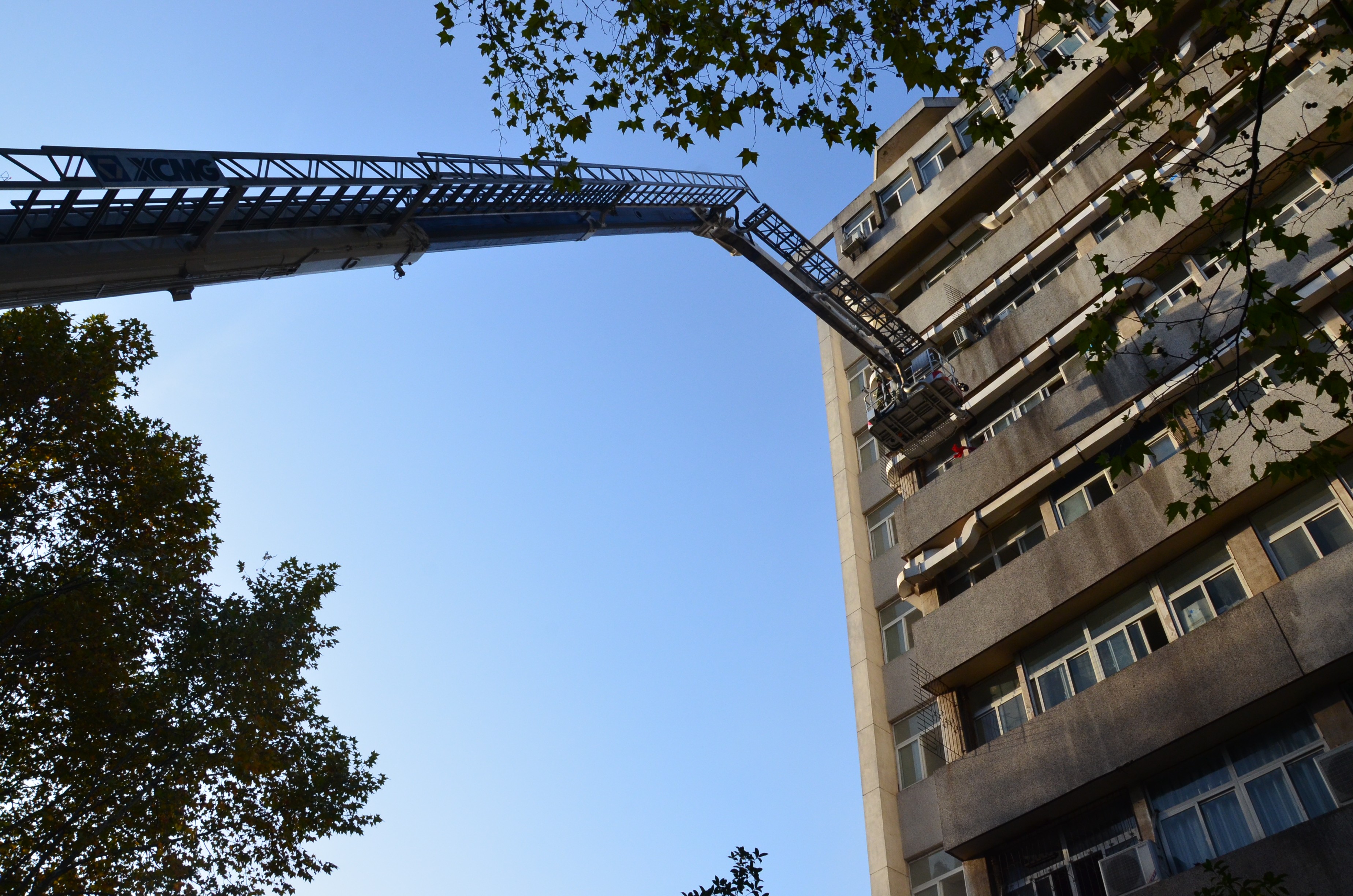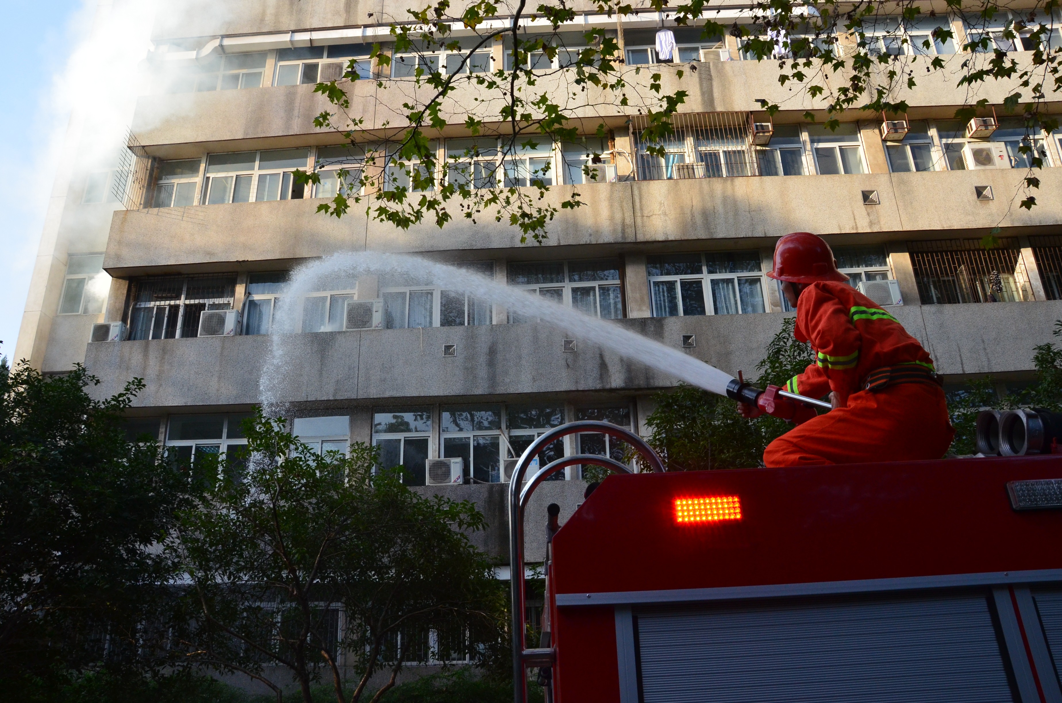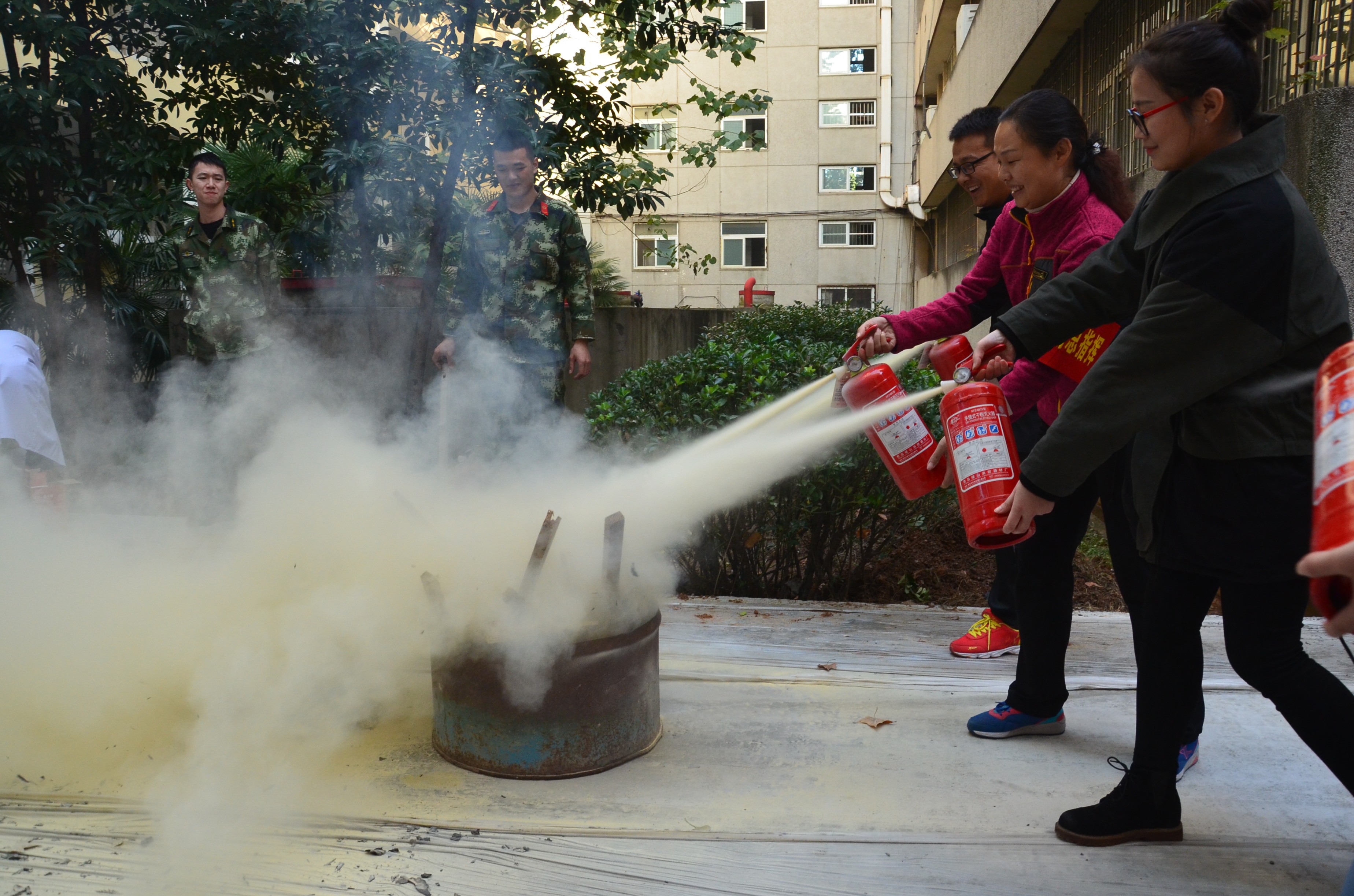 随后,在场的百余人积极配合,进行了火灾逃生演习:化学楼二楼出现“险情”并迅速蔓延,警报声响起,师生紧张但又有序的从化学楼各个楼层跑出,疏散员认真引导,抢险员及时扑救,报警后消防员迅速赶往“火灾”现场。两辆消防车分别进行了灭火、救援任务,一辆消防车从地面打出高压水柱扑灭了化学楼的“火灾”,消防云梯车从六楼窗口救出由化院党委副书记吴疆鄂老师扮演的被困人员,赢得现场一片掌声。逃生演习之后,由武汉市消防局的消防队员为我们演示了灭火器的使用方法,数十名师生亲身体验,使用灭火器,扑灭被点燃的火源。