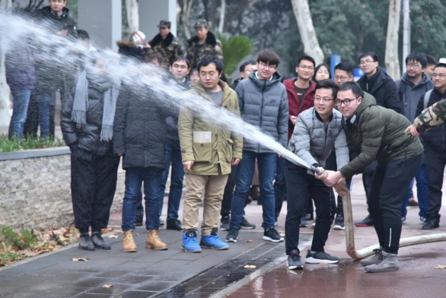 下午三点,演习正式开始,在3044永利集团官网大楼门口,校保卫处消防工作人员首先为参演师生演示了干粉灭火器、消防栓、消防水带、防毒面具等防火灭火器具的使用规范。接着参演师生利用干粉灭火器、消防水带等灭火器具对油桶中的明火实施了扑灭。随后,参演的学生还学习了防毒面具的使用方法,并亲身体验当人戴上防毒面具后呼吸环境的变化,掌握了火灾险情出现时的逃生技能。